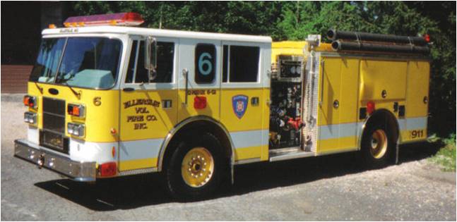 Engine-Rescue 6 is a 1996 Pierce Saber. This piece of apparatus has a 1500 gallon tank, 1250 gpm pump, and is a 8 man cab. This piece of apparatus currently carries extrication devices, and is equipped as an engine.